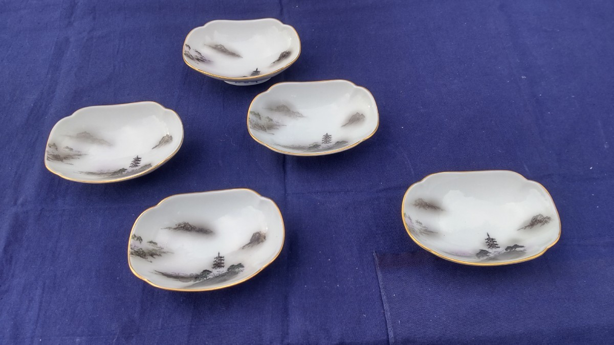 - オールド深川 薬味香味皿 5客 墨弾き四重の塔に桜