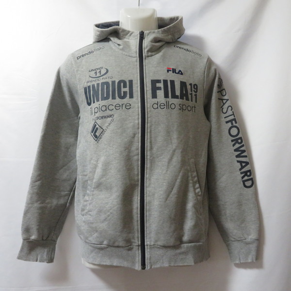 > 古着 メンズM FILA/フィラ スウェット ジップ フード パーカー ジャケット スポーツ カジュアル グレー FL-9C15021TJ