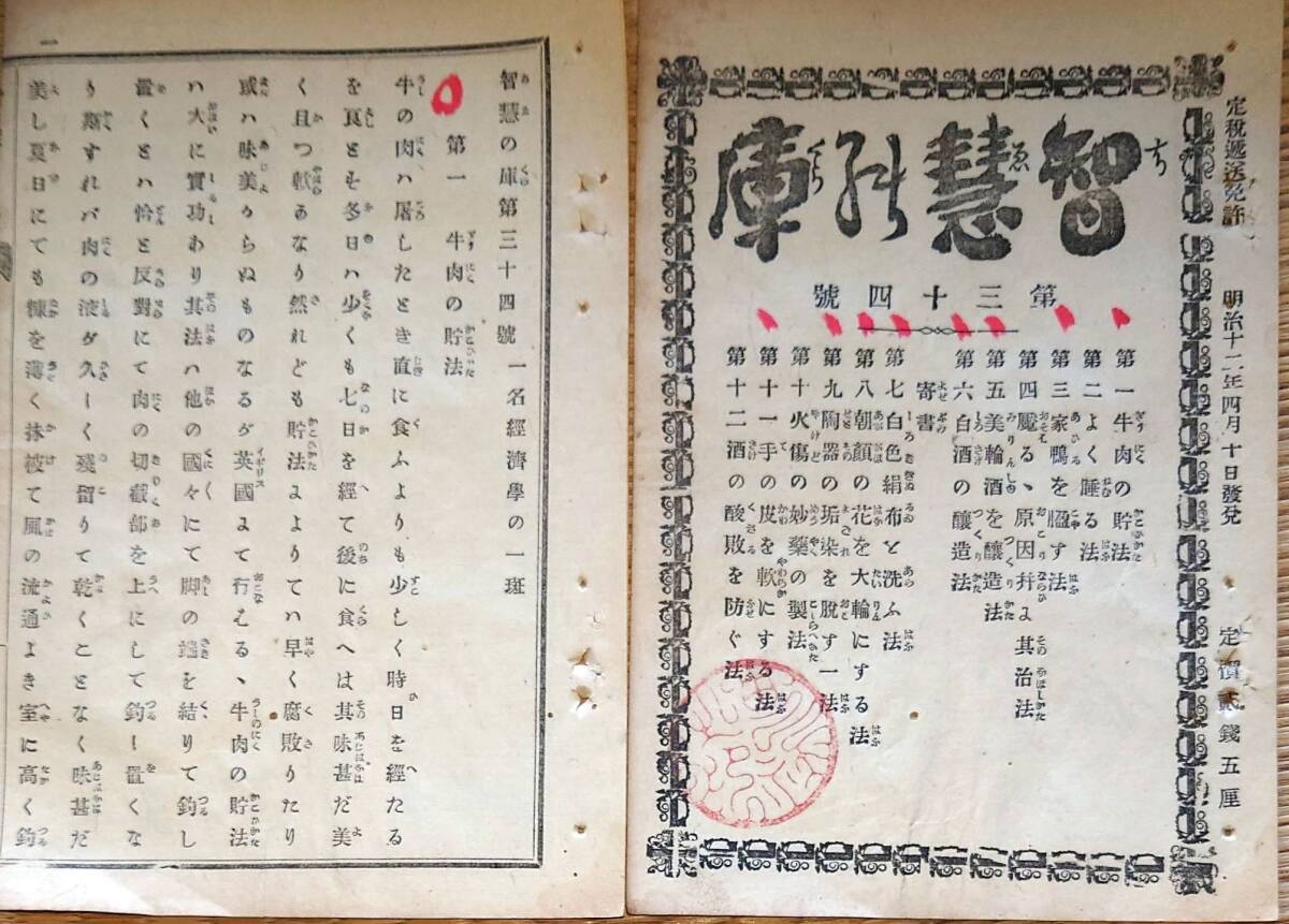 - f24021326〇知恵の庫 第34号 牛肉貯蔵法 白酒の醸造法 明治12年 由己社 うさぎ屋 東京鍋町 神田鍛冶町〇和本古書古文書