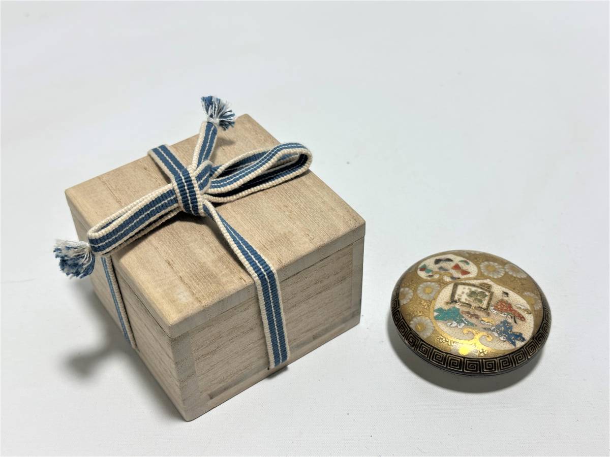 - E36●薩摩焼・秀山【色絵人物金襴細密図香合】花鳥文 香道具 陶器 共箱 在銘 重さ:約52g 現状品