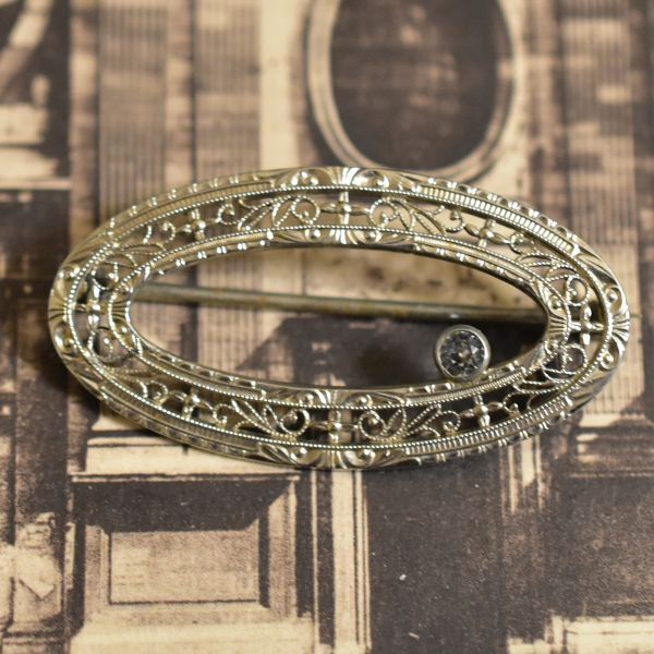 > アンティーク Krementz/クレメンツ 刻印 ホワイトサファイアのオープンワークのブローチ ミル打ち/ミルグレイン エドワーディアン 本物保証