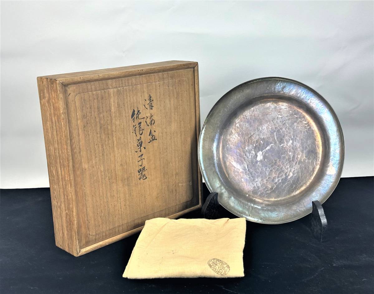 - E86●一東斎造【清海盆・純銀菓子器】銀皿 銀製 銀器 純銀刻印あり 共布 骨董品 アンティーク 在銘 共箱 重さ約:157g