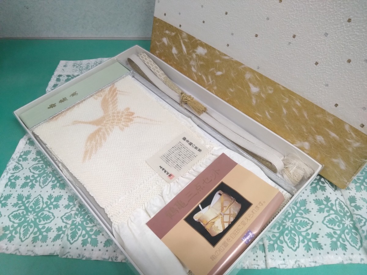 > ● D【長嶋成織物/瀞金錦】高級 総絞り 鶴亀 三点 セット 金彩 帯揚げ 帯締め 扇子 亀 飾付 婚礼 結婚式 祝い事 縁起物 箱入 中古 ③