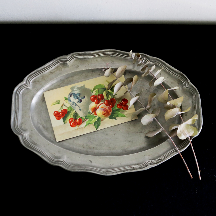 - 1800年代 花リム オーバル フランス 錫製 ピューター 器 皿 鉢 飾皿 陶器 民藝 骨董 古道具 美術 アンティーク 中世 ナポレオン ルイ 錫