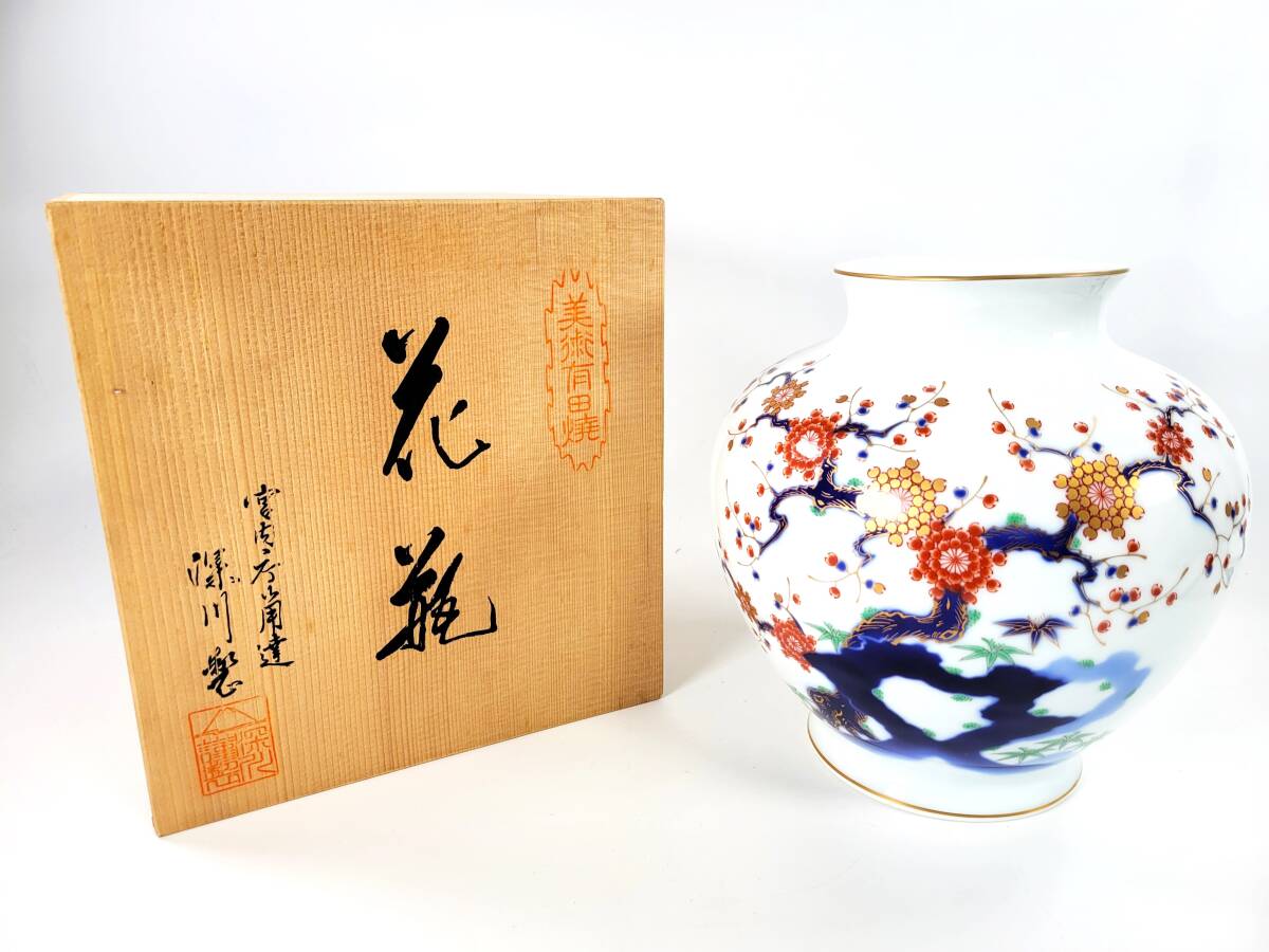 > 【長期保管未使用品・名品】 宮内庁御用達 深川製磁 有田焼 岩梅 大花瓶 桐箱付き