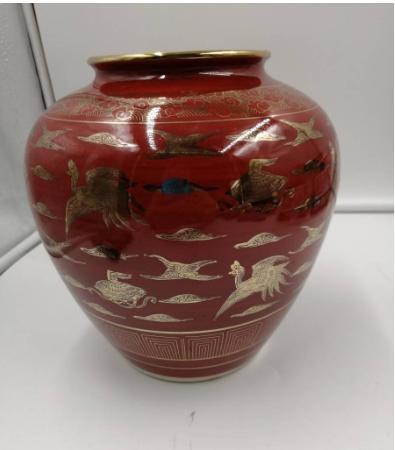 - 陶器 九谷焼 花瓶 共箱付 色絵 花器 縁起物 結婚記念 昭和58年3月 中古品 保管品