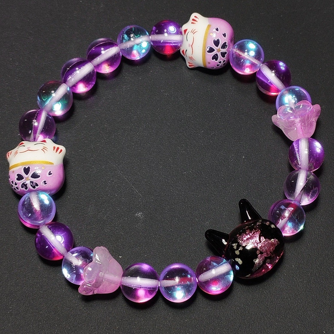 - 招き猫2匹(紫)・ルナフラッシュ・蓄光ホタルガラス(猫) ブレスレット 16cm