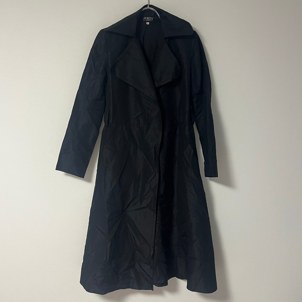 - FOXEY フォクシー 絹100% ロングコート トレンチコート チェスター ノーボタン アウター ブラック サイズ40