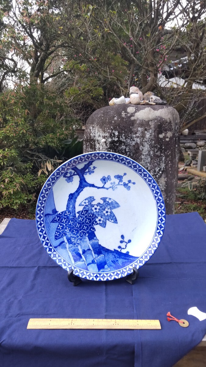 - 明治期 印版手 大皿 七宝文の縁に松竹梅 サイズ[直径37㎝高さ5㎝重さ2.1kg]