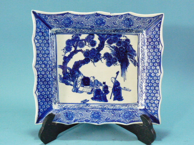 - 中国の染め付け飾り皿、角皿、松と人物画、縦26cmx横29cm