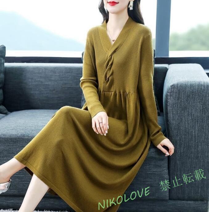 - 通勤新品秋冬 Vネック ニットワンピース ゆったり カシミヤ混 304050代 着やせ 長袖 ニットセーター ロングワンピース AA043