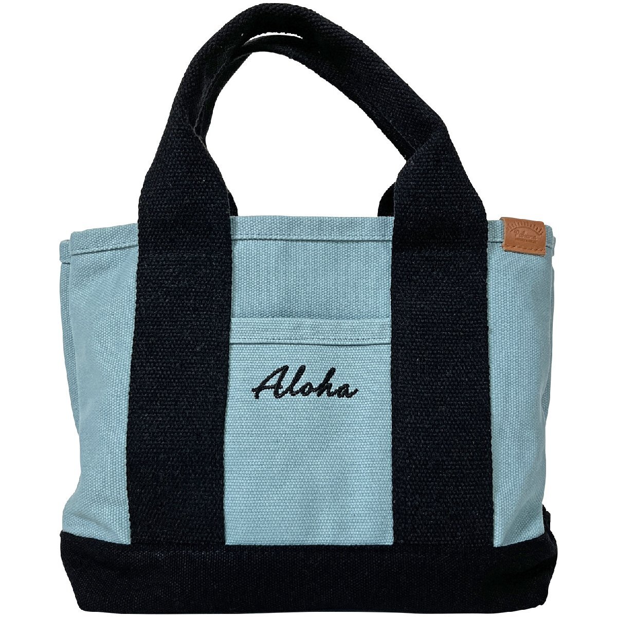 - Aloha刺繍入り ハワイアン ミニトートバッグ 幅21×高さ24×マチ16cm サックス 配色 綿100%