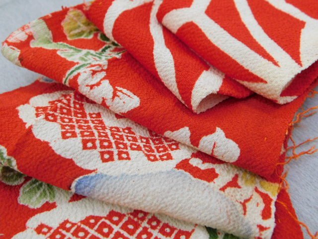 - 〔楽布〕P28721 縮緬 ハギレ 四分の一巾 二枚 古布古裂 大正ロマン k