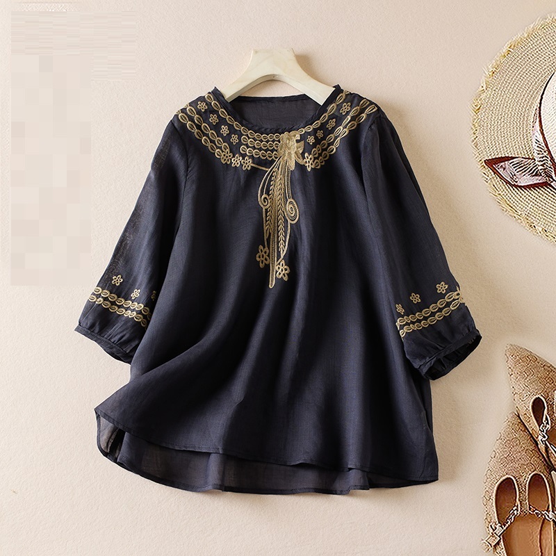 - 新品* ナチュラル カジュアル ブラウス 綿麻 刺繍入り トップス 薄手 着心地 可愛い 大人 おしゃれ 大きいサイズ チュニック *ネイビー