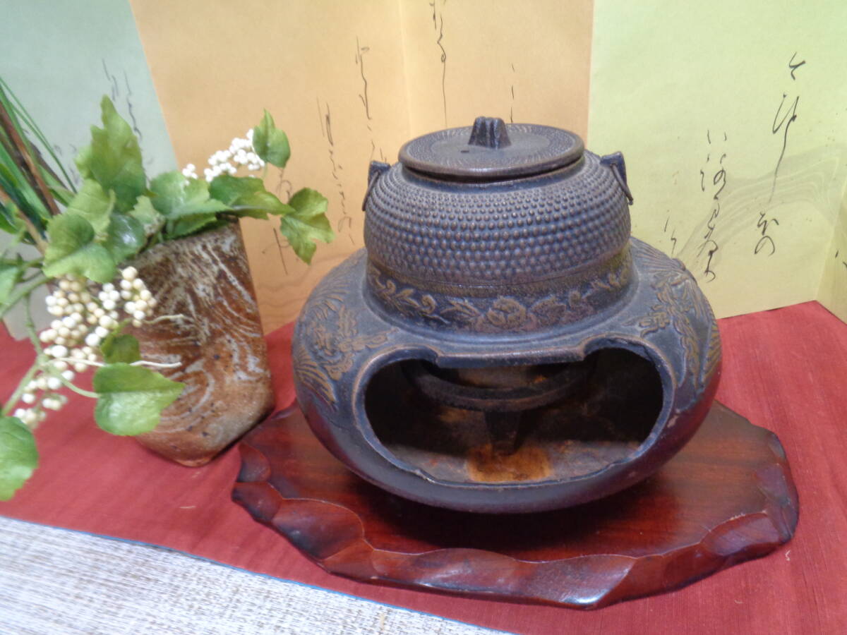 - 骨董 茶道具 南部鉄器 風炉釜三つ足 鳳凰柄 在銘有 中古品