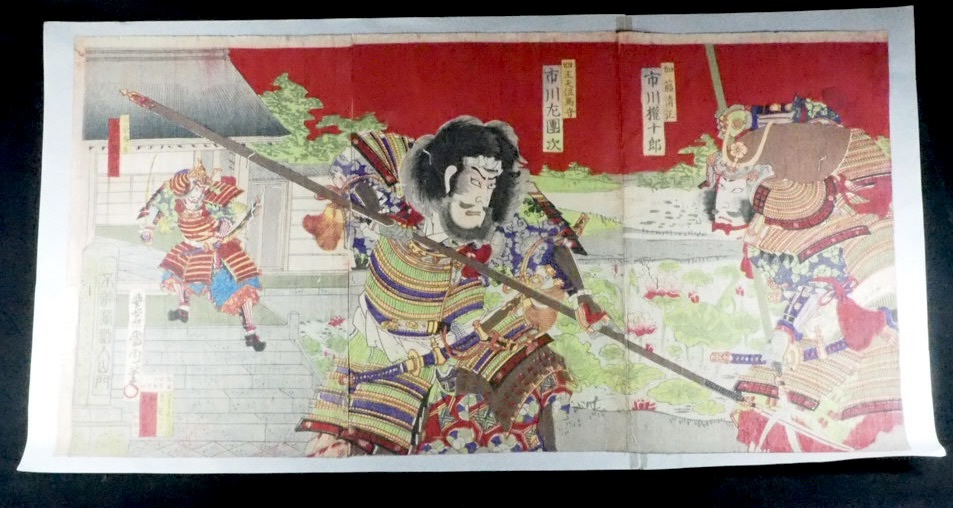 > 浮世絵版画 歌舞伎役者絵 豊原国周作「市川團十郎」大判3枚続 錦絵 裏打有 SMN604(3-7)