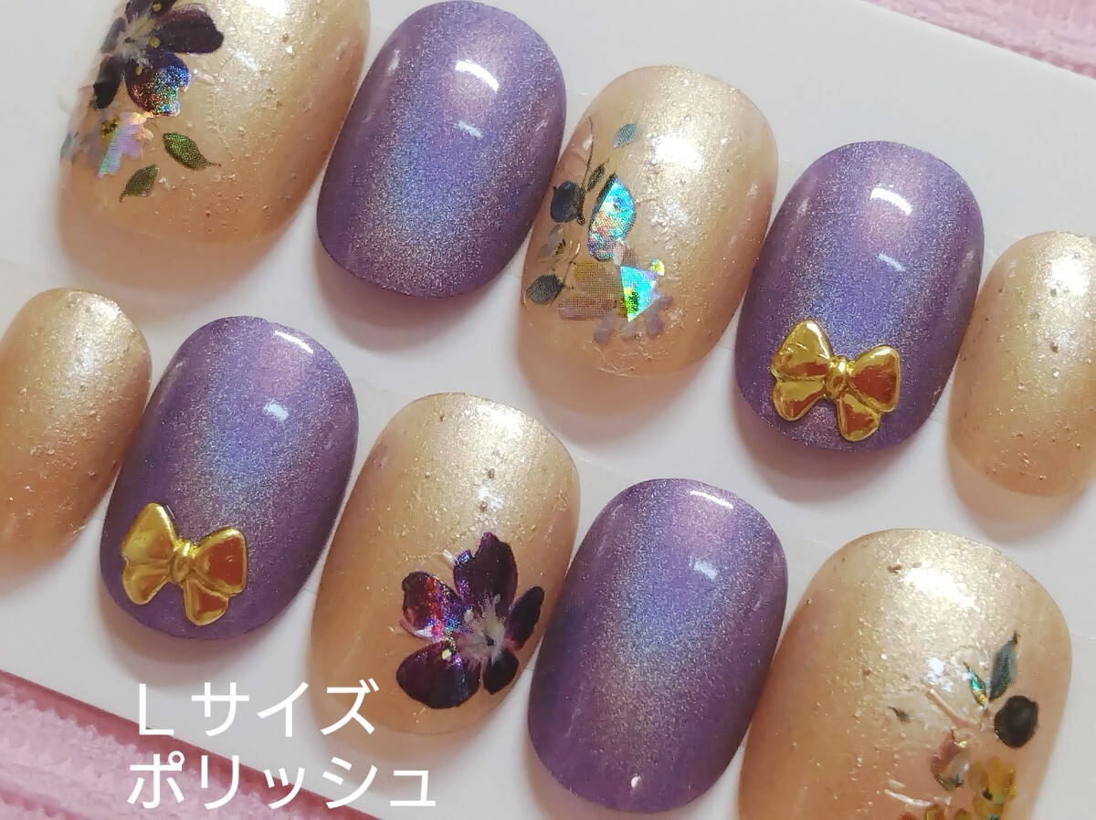 > Lサイズベリーショート・ライトゴールド×メタリックパープルフラワーゴールドリボンパーツネイルチップ付け爪ハンドメイド