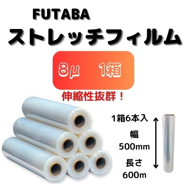 - ストレッチフィルム(手巻用) / 8μ(ミクロン) / 幅500mm / 長さ600m / 1箱 6巻入【1箱】 送料無料 未使用 FUTABA
