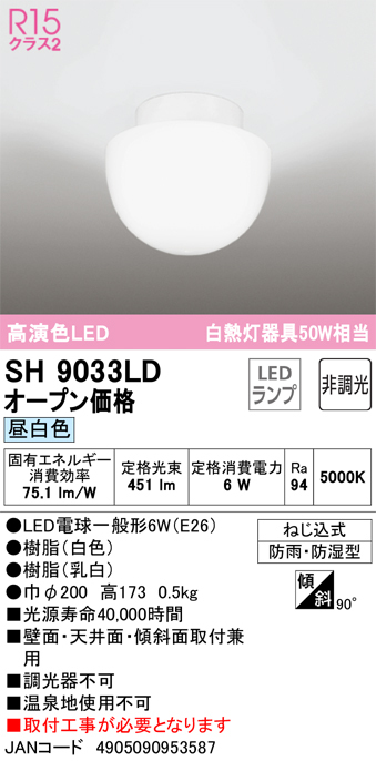 > オーデリック SH9033LD LED 浴室灯 JAN4905090953587 jyu a