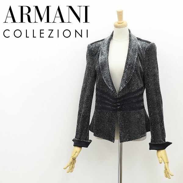 > 美品◆ARMANI COLLEZIONI アルマーニ コレッツォーニ ストレッチ 総柄 テープ使い ベロア ショールカラー ジャケット ブラック×グレー 42