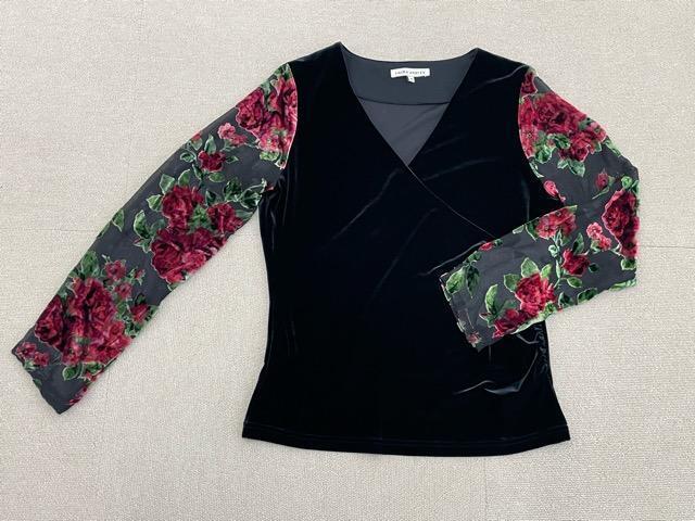 > (J01340) ローラアシュレイ LAURA ASHLEY フラワージャガード カシュクールベロアカットソー M ブラック系