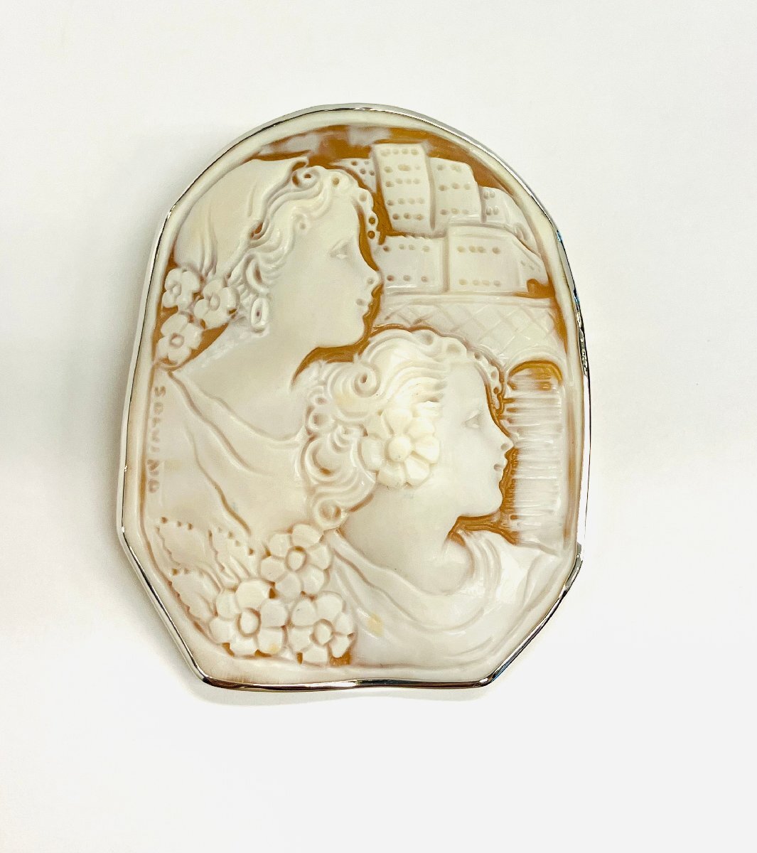 - K18WG 特大カメオ SOLVINO ブローチ×ペンダントトップ 花と乙女達 作家物 qoj.Z2205