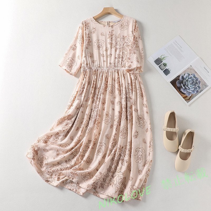 - 新品カジュアル 気質 ゆったりサイズ プリント柄 Vネック 半袖 ミドル丈ワンピース アプリコットピンク LE840