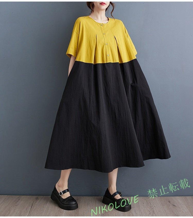 - 新品レディース エレガント 切り替え ゆったり大きいサイズ体型カバー 半袖ロングワンピース 配色 黄色い LE890