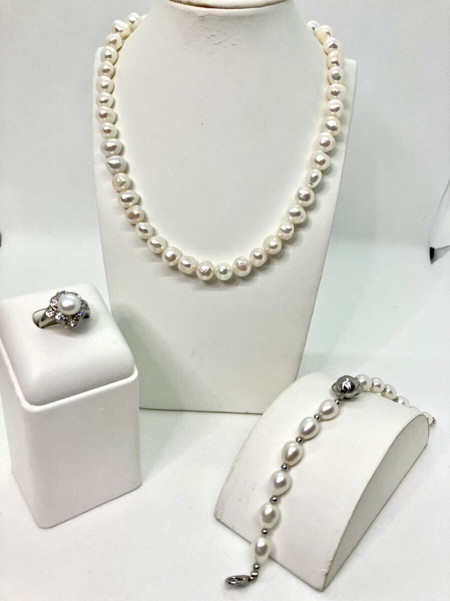 > 【新品未使用】淡水パールネックレス&ブレスレット&リング三点SET/バロック/真珠/シンプル一連/フォーマル/6月誕生石/Pearl