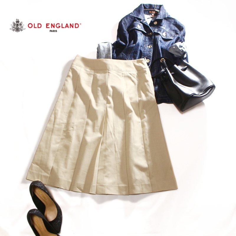 - 美品 OLD ENGLAND オールド イングランド 春 夏 上質 サマーウール 膝下丈 プリーツフレアスカート 7号 36 淡い ベージュ 日本製
