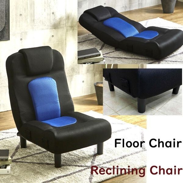 - 新品★後藤家具★ポケットコイル入り!42段階リクライニングソファー♪12cm脚取り外しでワイドフロアチェア/座椅子に【BLACK x BLUE/黒x青