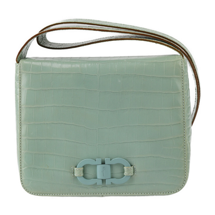 - 美品 サルヴァトーレ フェラガモ ガンチーニ ショルダーバッグ 216195 クロコ型押しレザー グリーン系【本物保証】