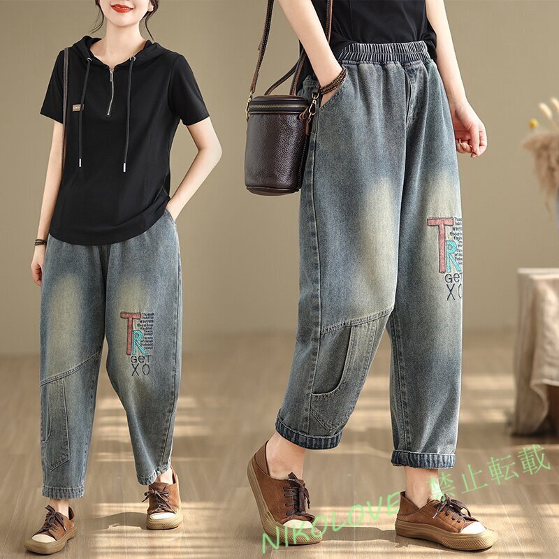 - 新品 人気デニムパンツ バルーン デニム レディース 大きいサイズ ゆったり ボトムス ハロンパンツ ウエストゴム 着痩せ 美脚 XL LH141