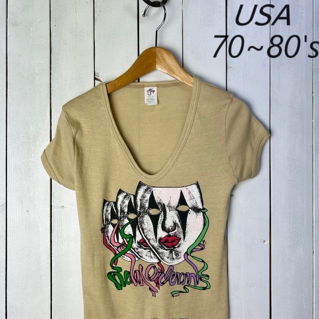 > T●341 USA古着 70s~90s USA製 仮面柄 フライスチビTシャツ S~M オールド ヴィンテージ アメリカ古着 スキニーTシャツ タイト