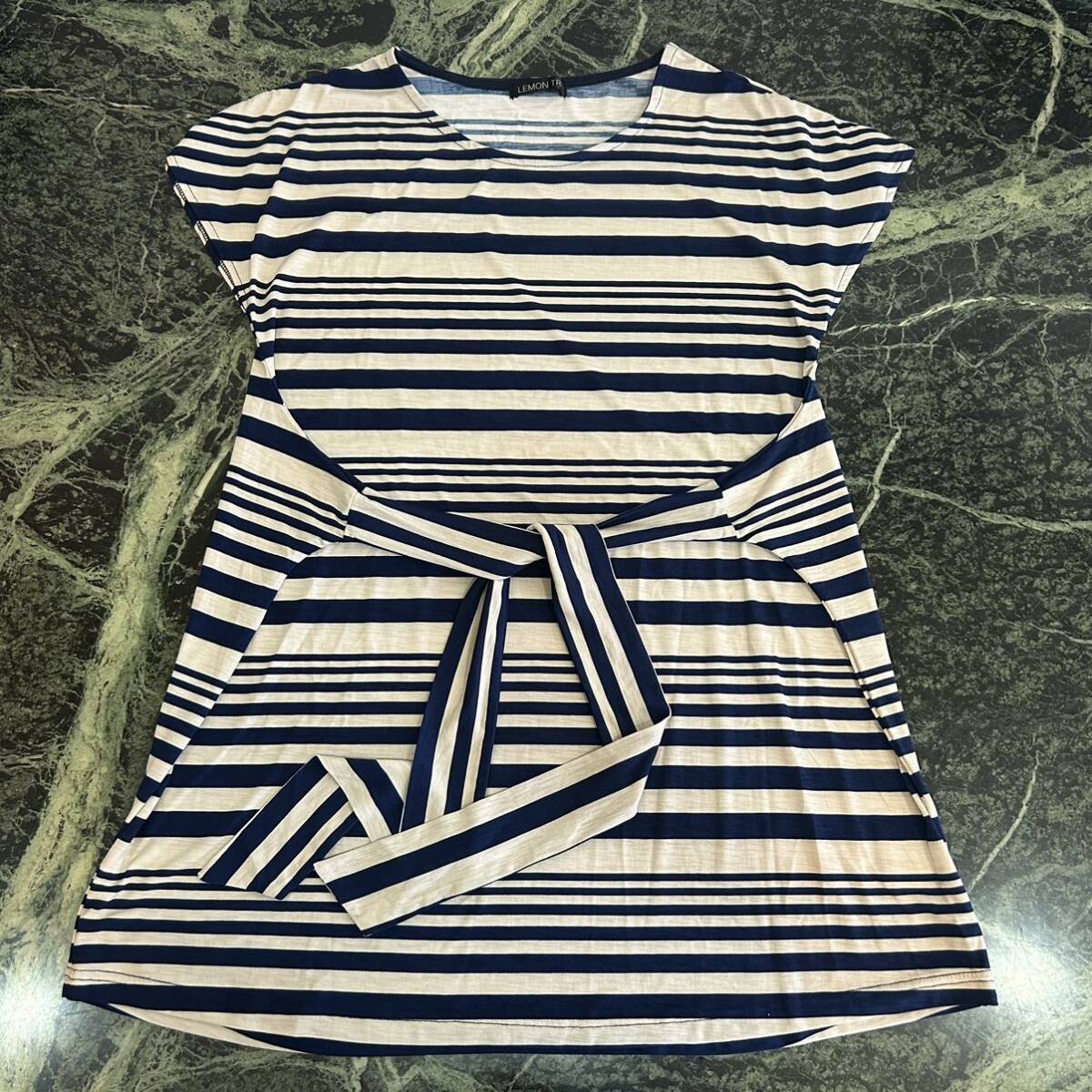 - 【極美品】LEMON TREE★レモンツリー ボーダーチュニック フレンチスリーブ ネイビー×グレージュ 半袖 ウエストリボン