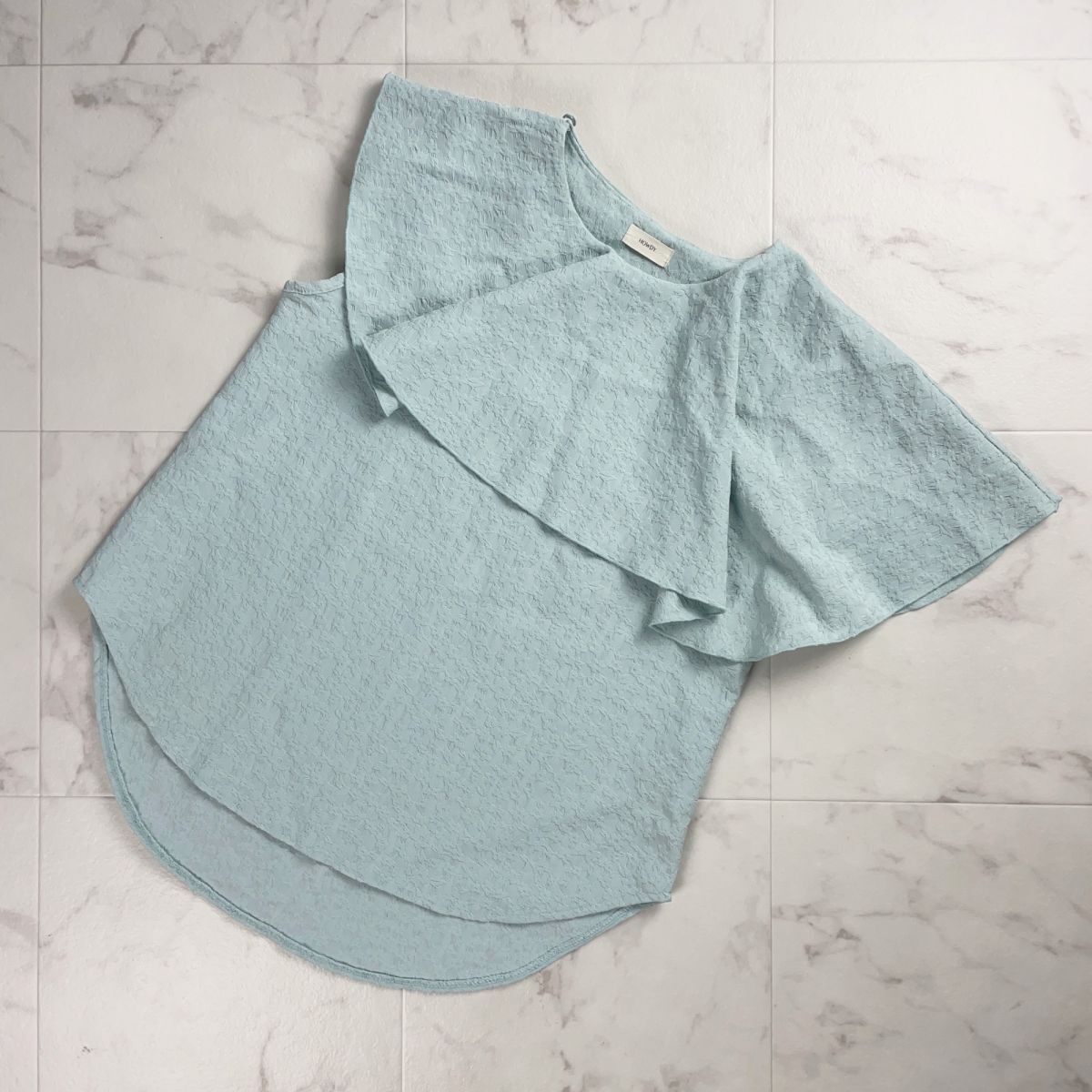 - 美品 howdy ハウディ 花柄エンボス風 フリルカラーアシンメトリーブラウス ノースリーブ トップス レディース 緑 サイズM*RC777