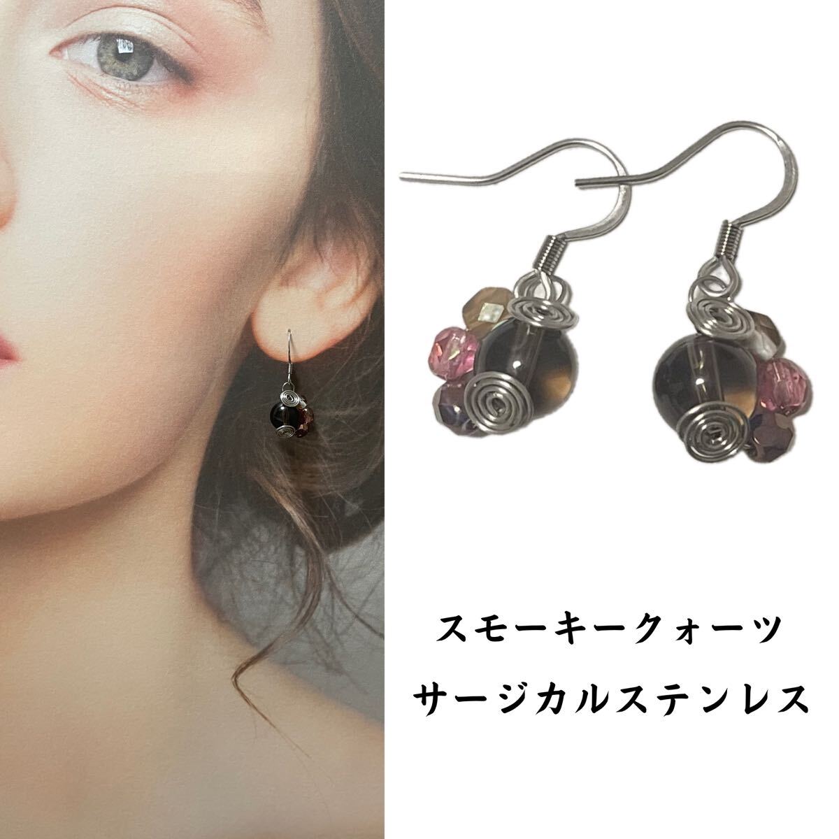 - W106. 天然石 ピアス スモーキークォーツ ハンドメイド サージカルステンレス アレルギーフリー ニッケルフリー