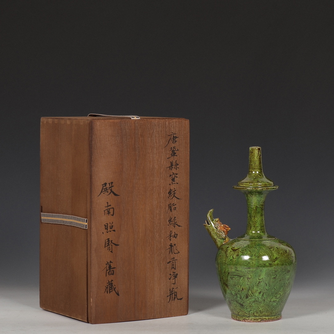 - 絞胎 緑釉 龍首淨瓶 仙盞形水瓶 唐物 箱付き 陶磁器 中国美術 置物 賞物 RG202