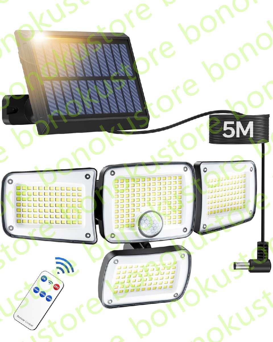 > ソーラーライト 屋外 防水 分離型 センサーライト333LED/人感センサー/4灯式/IP65防水/5M延長コード 防犯ライト