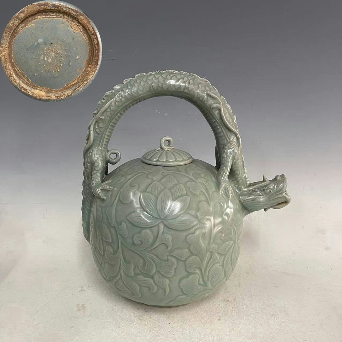 - 珍品旧蔵 朝鮮 高麗磁 朝鮮古陶磁器 古高麗 李朝時代 高麗青磁陽刻龍紋壺 P672