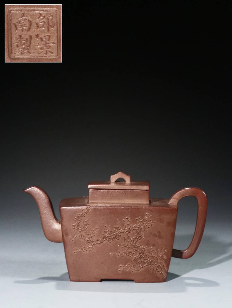 > 茶器 紫砂壷「邵景南」在銘 朱泥「梅花泥絵橋ボタン方壺」急須常滑 茶壷煎茶道具 時代物 古陶芸 長15 cm、幅6.8 cm、高さ8.8 cm LB-8021