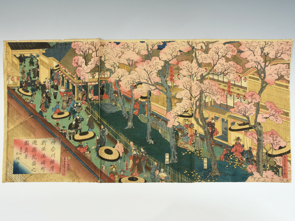 - 【真作】 歌川貞秀 大判錦絵三枚続 「神奈川横浜新湊港崎町遊郭花盛之図真景」 万延元年(1860年) 錦絵 木版画 版画 明治版画 浮世絵 z7856t