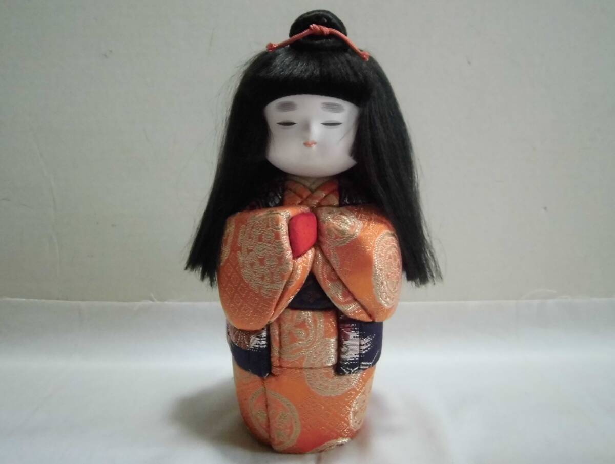 - 小さめ 木目込み人形 オレンジ色の着物姿 市松人形 日本人形 工芸品 置物 飾り物 オブジェ レトロ