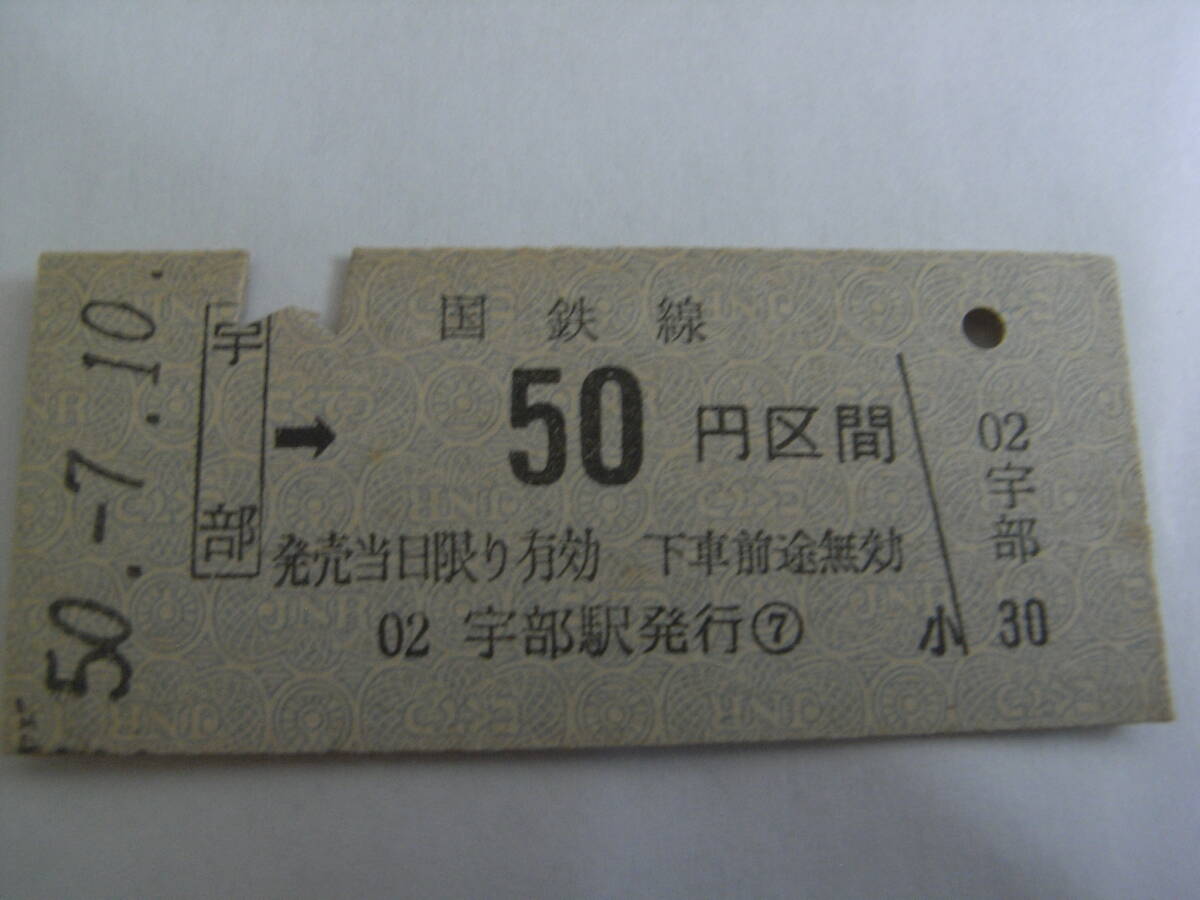 - 山陽本線 宇部→国鉄線50円区間 昭和50年7月10日 宇部駅発行 国鉄