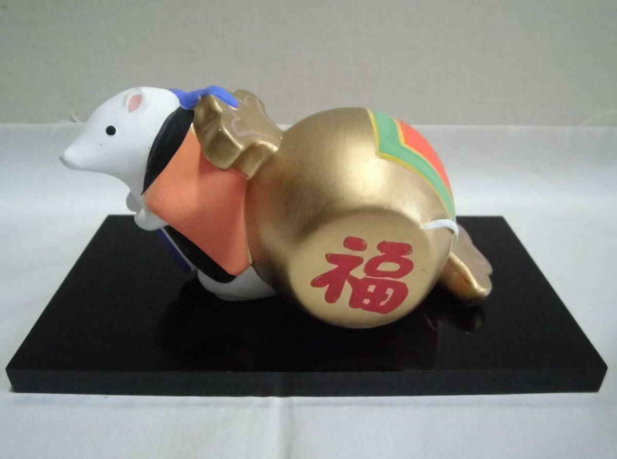 - 干支置物 子 飾り台付き 打ち出の小槌を担ぐ 十二支 色絵 金彩 鼠 ねずみ 陶人形 土人形 招福 開運 縁起物 飾り物 オブジェ 工芸品 レトロ