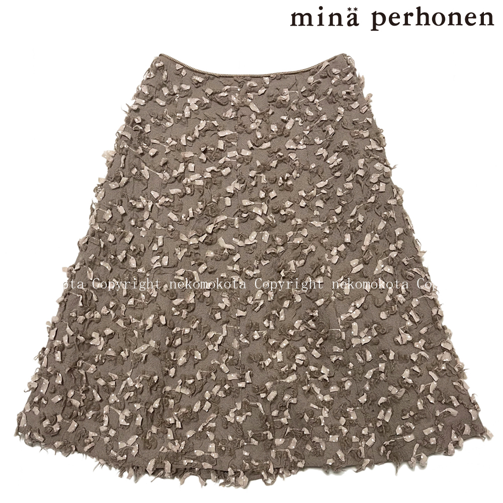 > 美品 ミナペルホネン lumi ウール ドット リボン カット ジャカード スカート 36 グレージュ グレー ベージュ mina perhonen