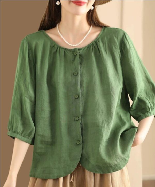 > 新品*ラウス レディース 半袖 シャツブラウス 無地 夏 トップス チュニック 上品 大人 シンプル ゆったり 着痩せ きれいめ*グリーン*M
