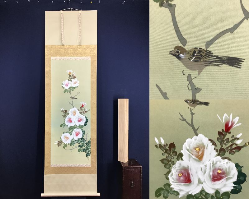 - 真作/春峰/花鳥図/雀図/バラに小禽図/花に小禽図/掛軸☆宝船☆AG-691