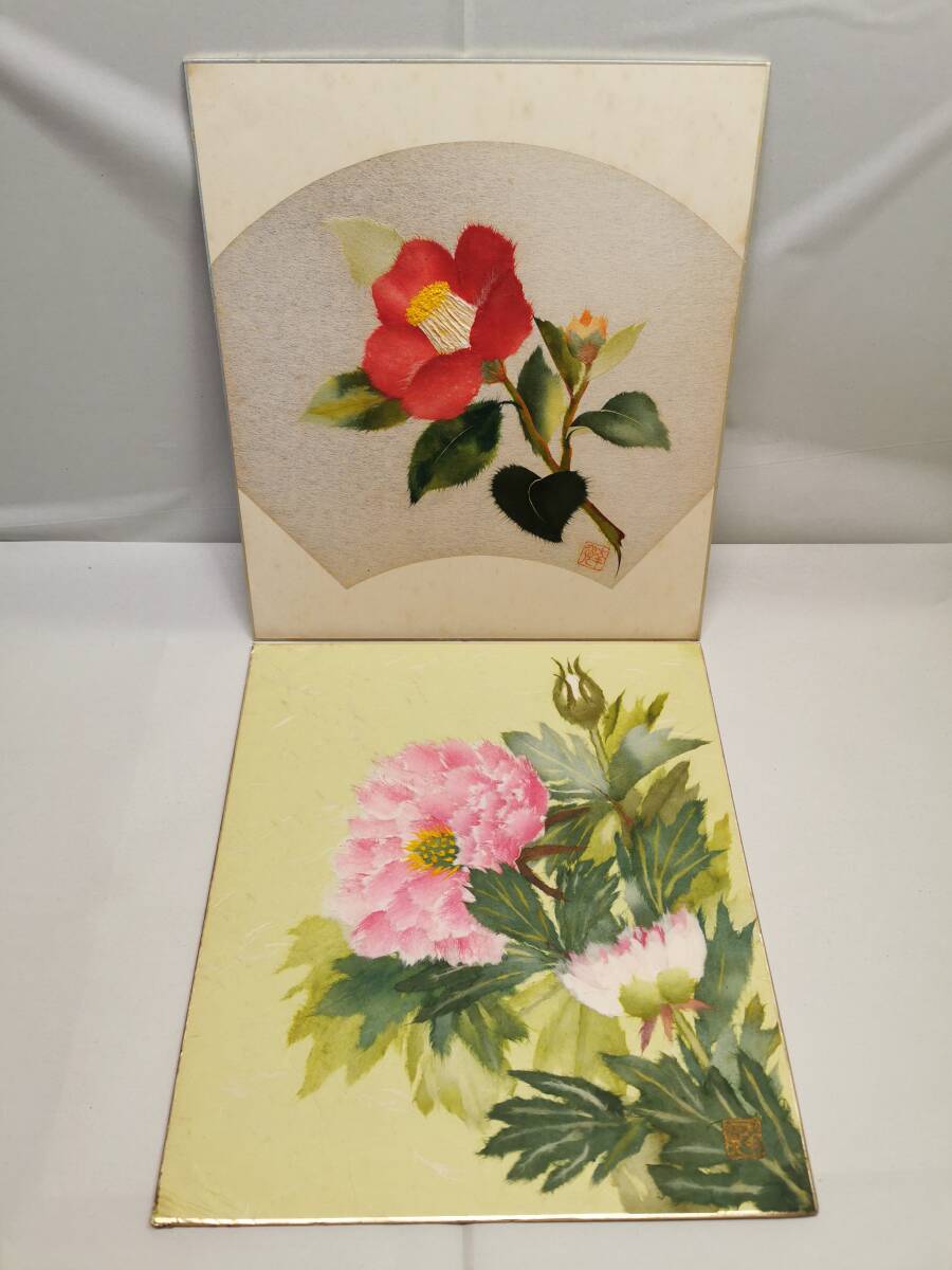 > 2点セット◆和紙 ちぎり絵 色紙絵 個人作品 牡丹 椿◆人間国宝 安部栄四郎 の和紙使用 昭和レトロ 和紙工芸 はり絵