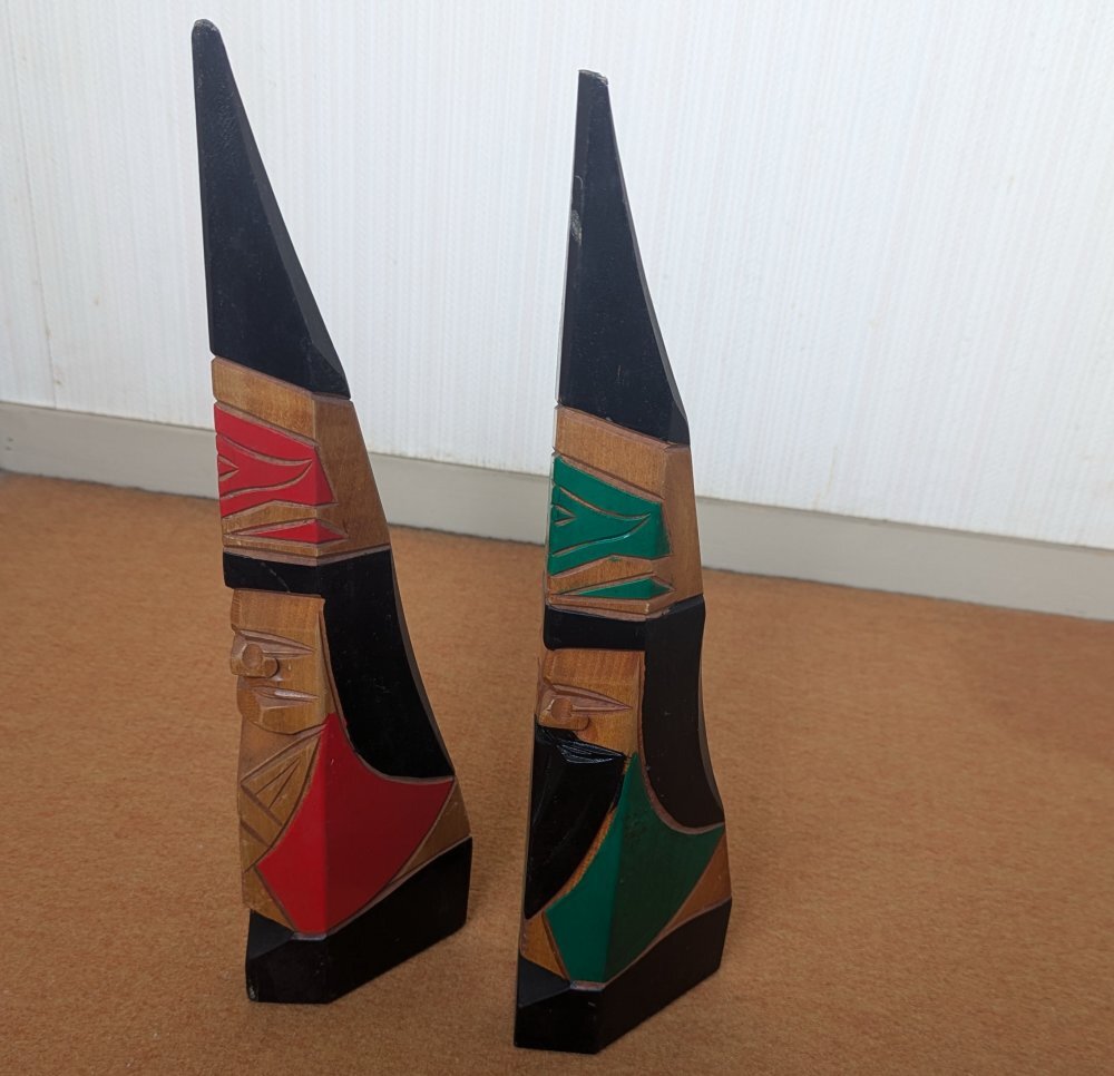 - 木彫り 人形 顔 2個セット 赤 緑 レトロ アンティーク 古い